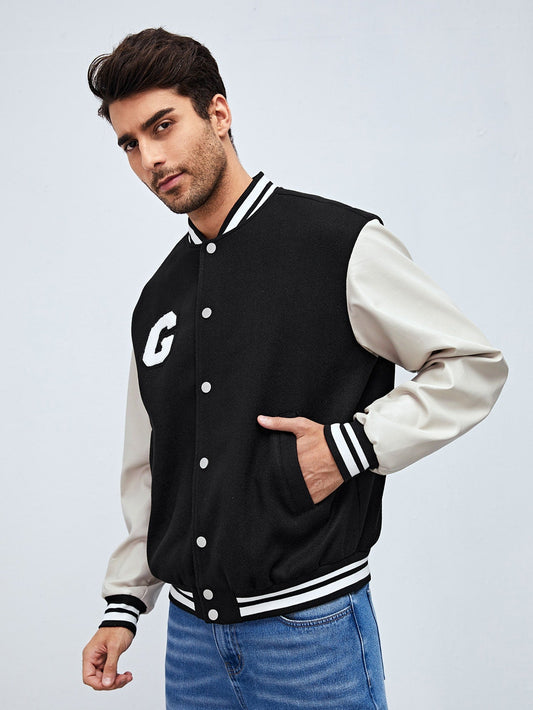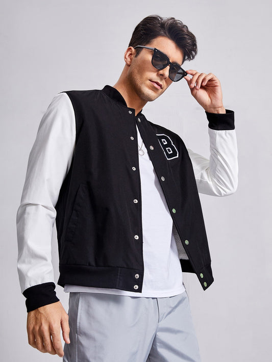 Black Drop Shoulder Letter Patched Color Block Bomber Jacket